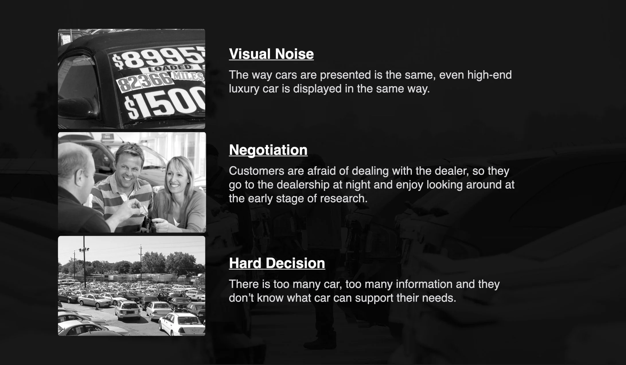 Buying a car is a high-stakes decision, and many buyers lack car expertise—especially in pre-owned purchases where fear of overpaying is high. Dealer-driven interactions can add pressure, making it harder for customers to compare options calmly and feel confident about their final choice.