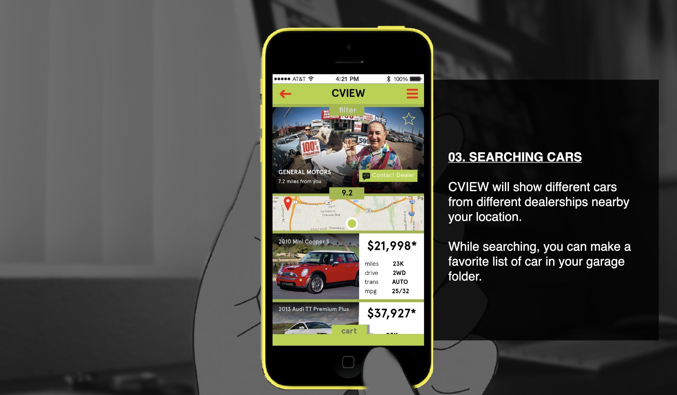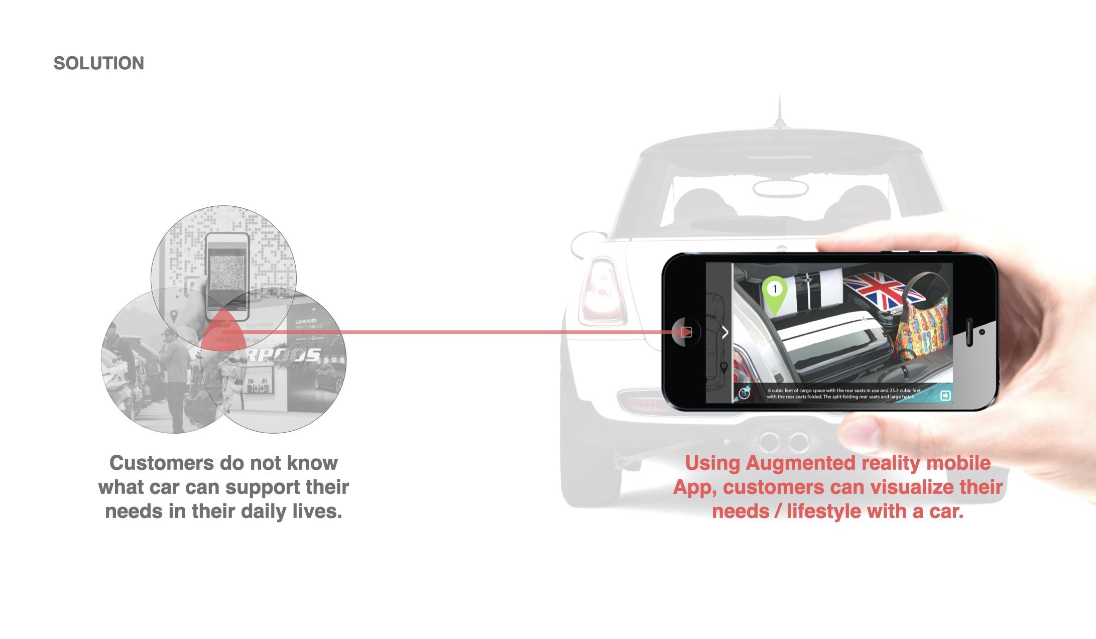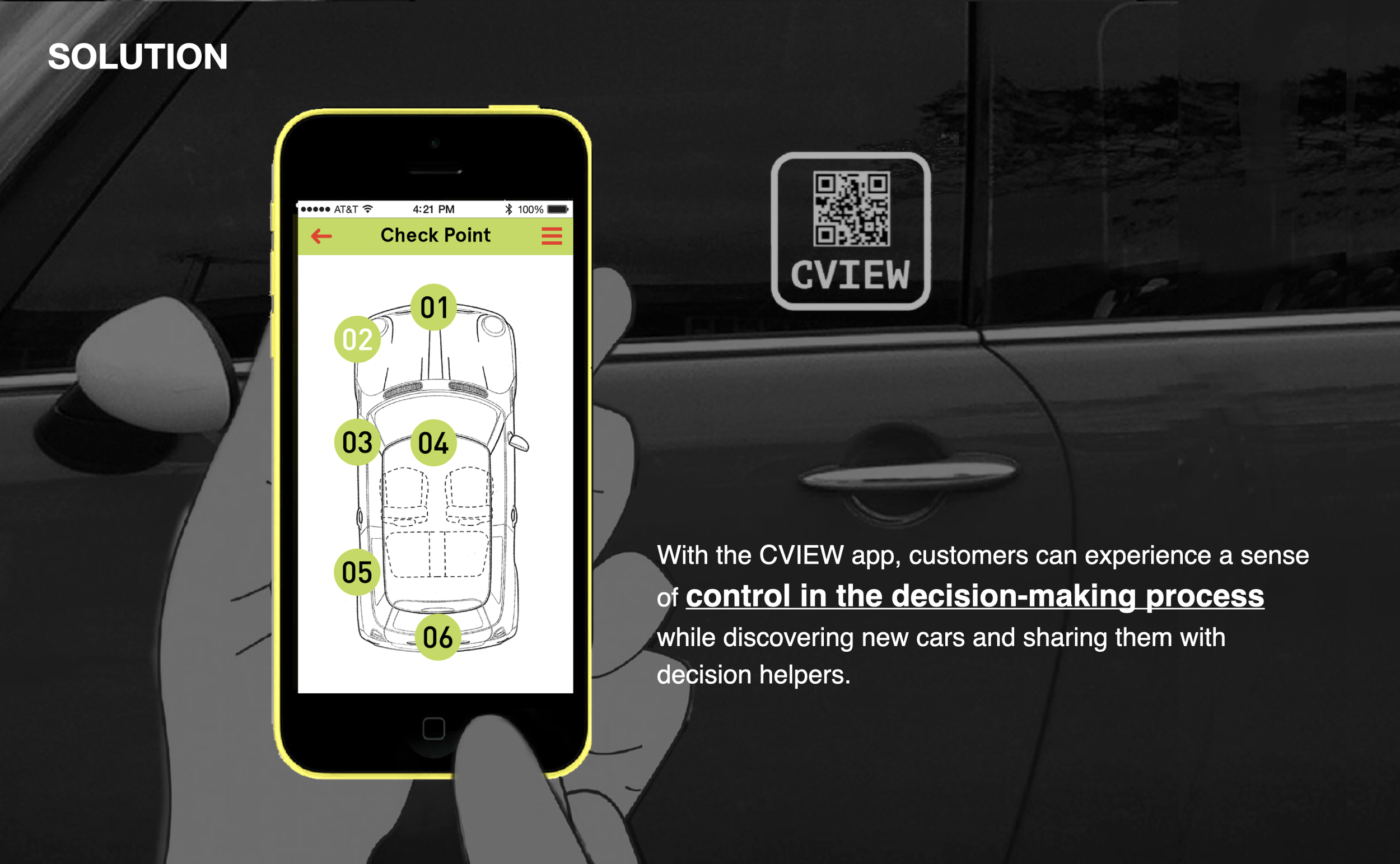 Concepted CVIEW, an augmented reality mobile app that lets customers visualize cars in their lifestyle context before stepping into a dealership. The differentiated value was shifting control to the buyer: users could explore, compare, and share options with decision helpers—reducing dealer pressure while making the journey more engaging. By pairing AR previews with structured comparison and shareable info cards, buyers could validate options with advisors before committing.