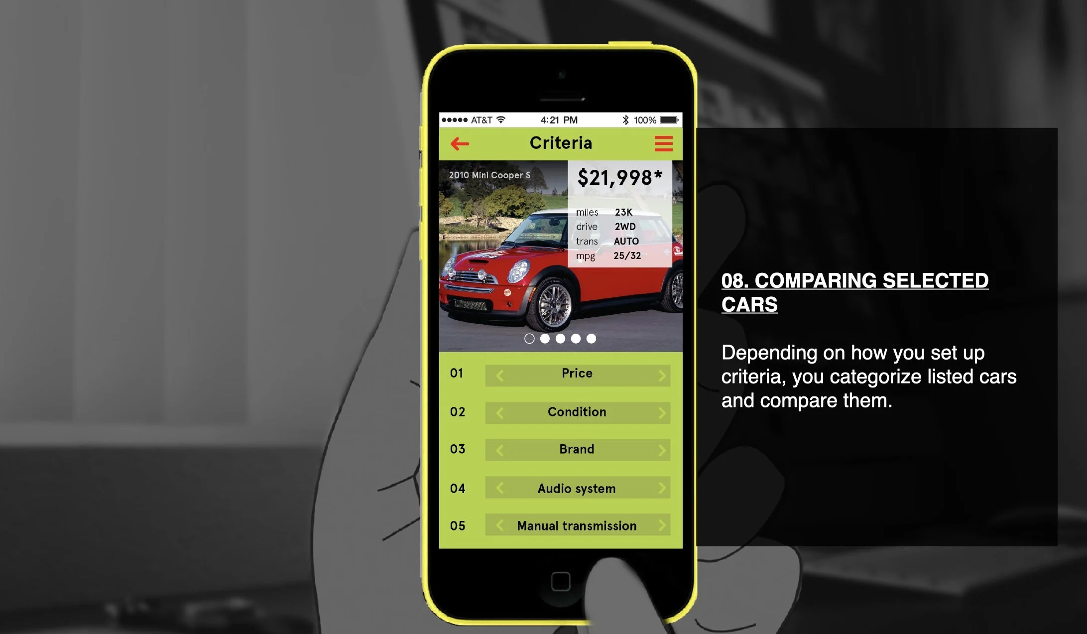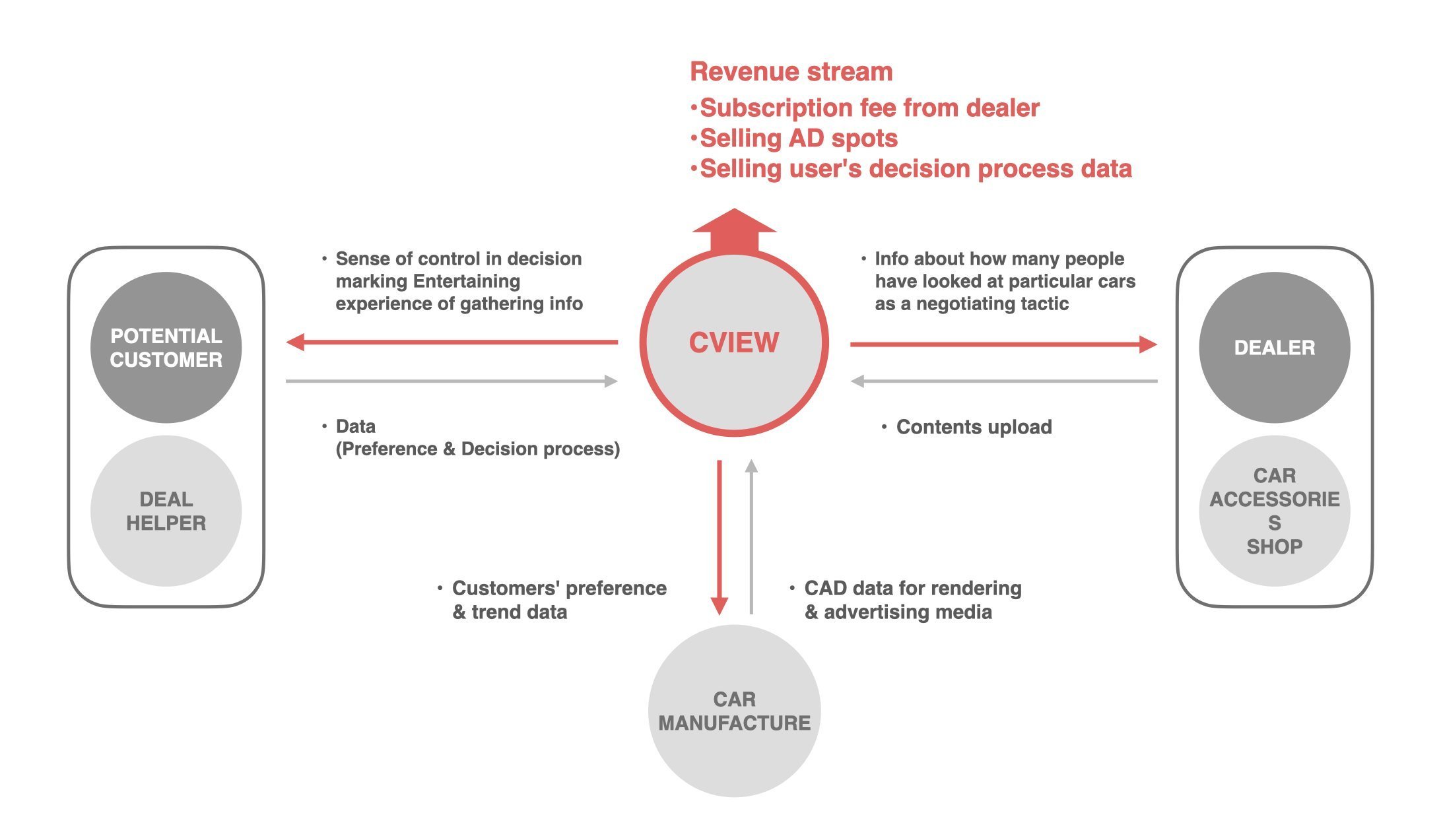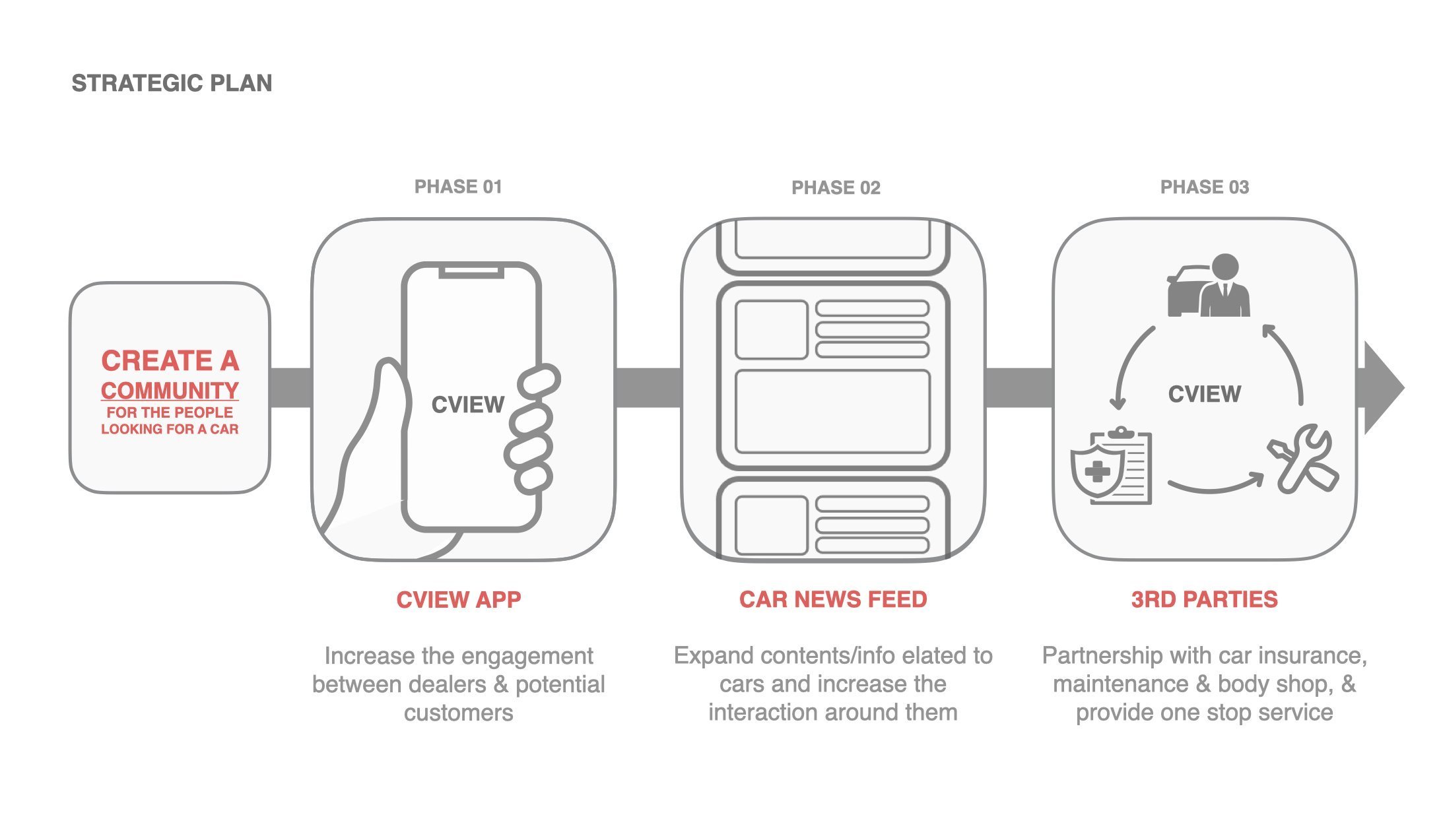 Concepted CVIEW, an augmented reality mobile app that lets customers visualize cars in their lifestyle context before stepping into a dealership. The differentiated value was shifting control to the buyer: users could explore, compare, and share options with decision helpers—reducing dealer pressure while making the journey more engaging. By pairing AR previews with structured comparison and shareable info cards, buyers could validate options with advisors before committing.