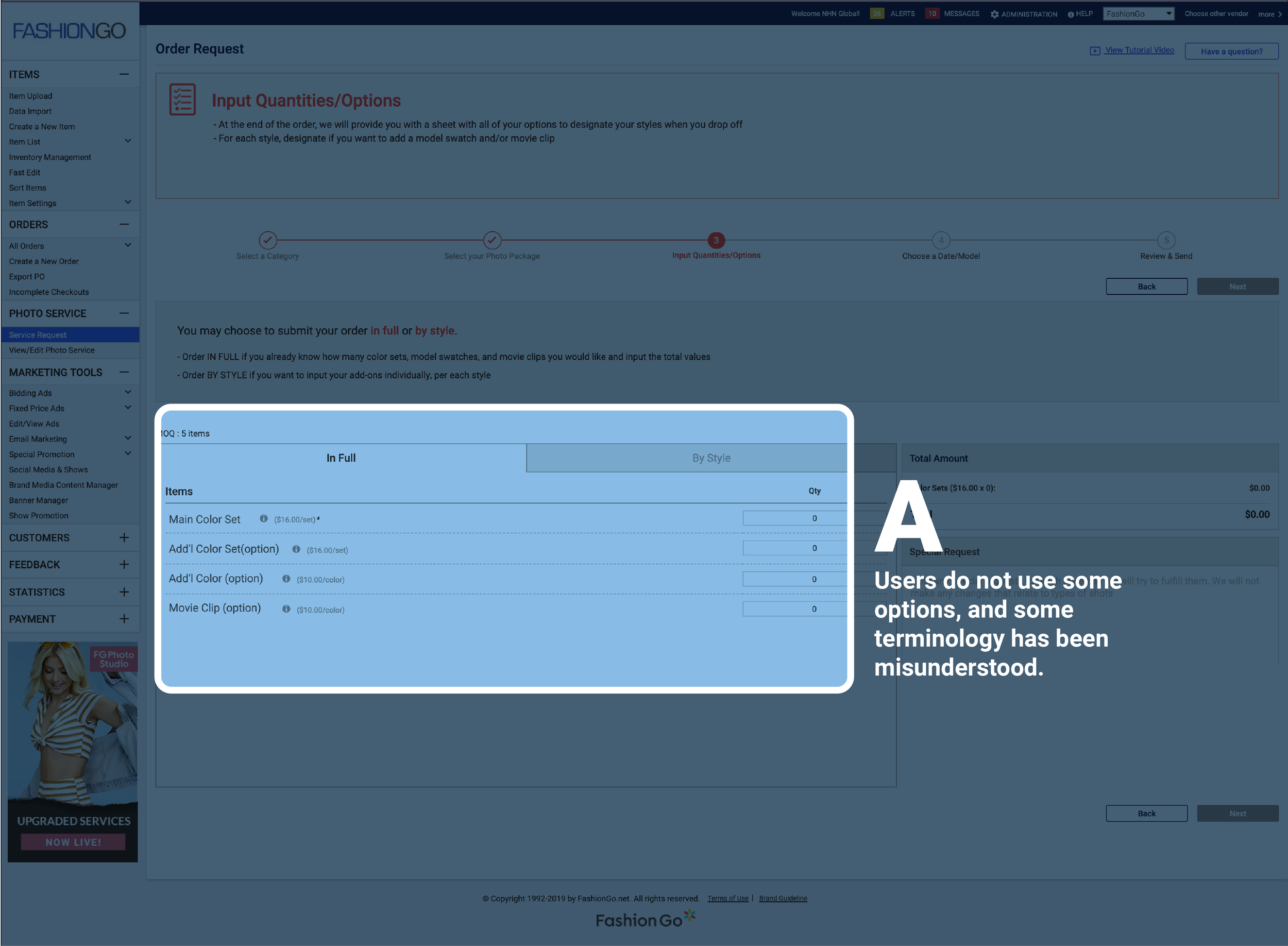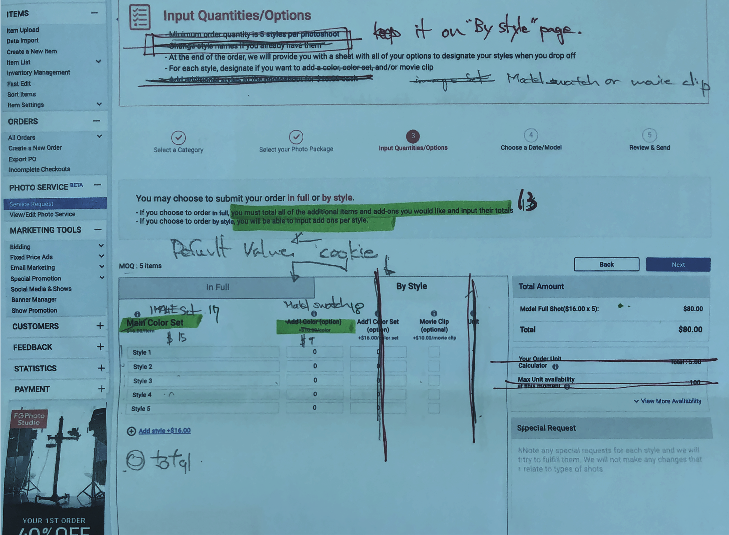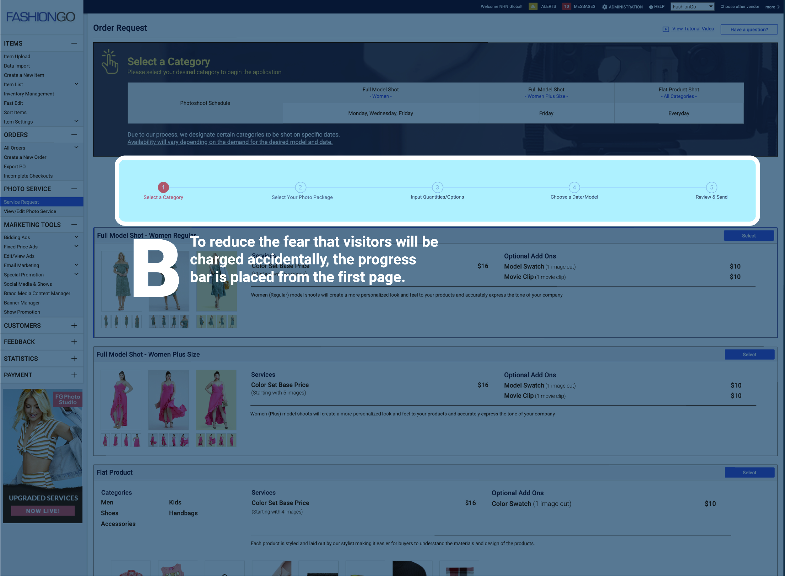 FashionGo’s marketplace success depends on product imagery, but most sellers lack in-house capability to produce consistent, on-trend photos. Outsourcing was common, yet the experience was often expensive and difficult to navigate due to manual processes and unclear pricing. This project was needed to turn product photography into an accessible platform service that sellers could use quickly and confidently. As listing quality varied widely, buyers hesitated to purchase and smaller vendors struggled to compete—creating a direct risk to conversion, perceived trust, and seller retention.