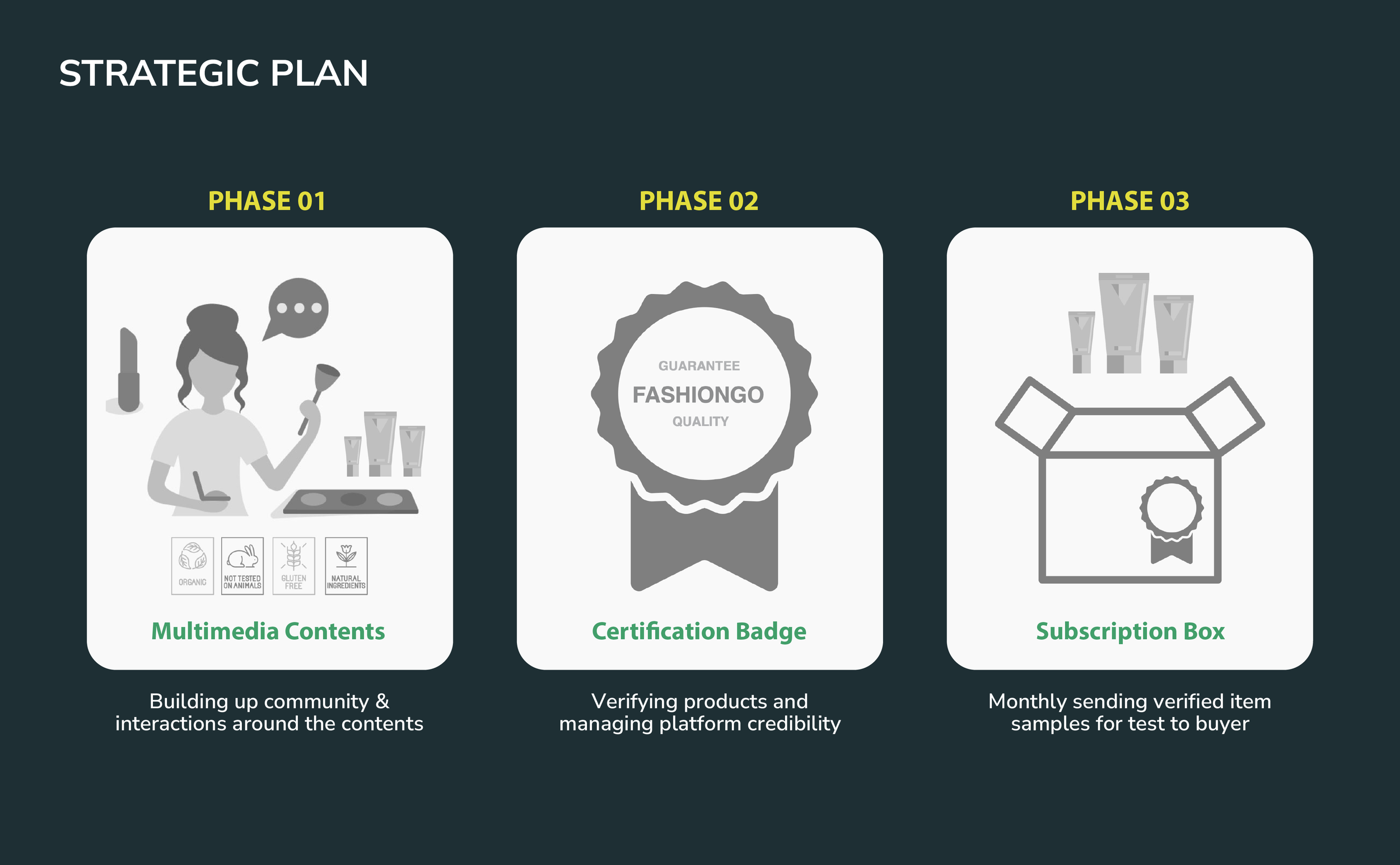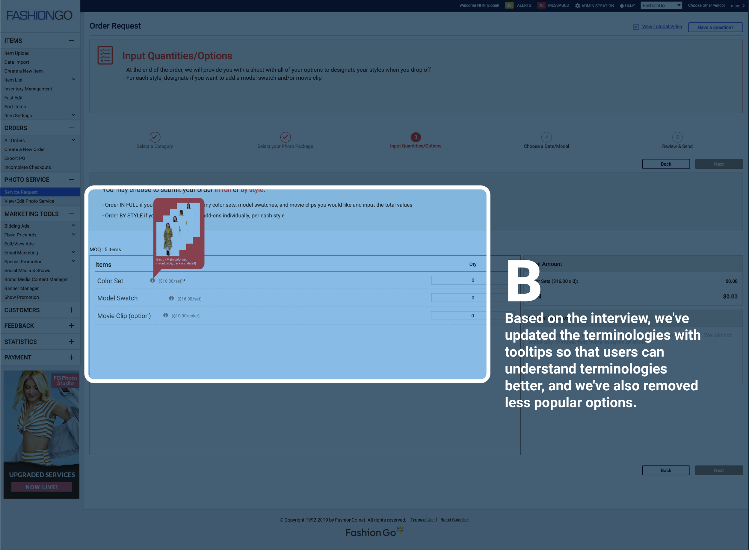 Designed a multimedia service that turns complex B2B product details into easy buying guidelines and structured seller/product storytelling inside FashionGo. By making pricing, packaging, compliance, and credibility easier to understand and validate, the service reduces buyer uncertainty and supports stronger buyer relationships. This also increases platform control by standardizing how product credibility is communicated—beyond what any single seller can influence.