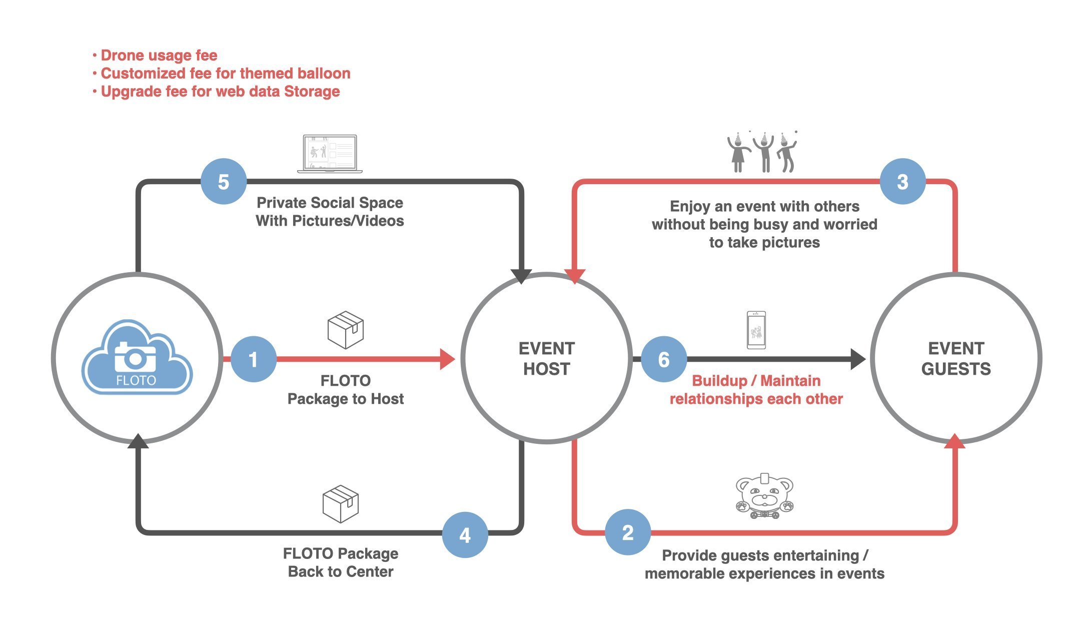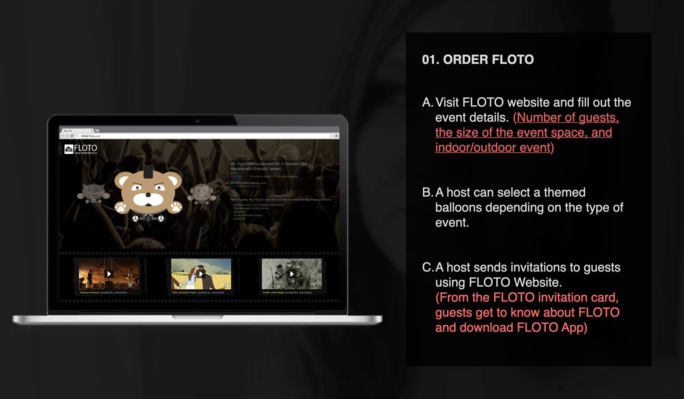 Designed FLOTO, a helium balloon-based flying photo booth that captures photos on demand with less reliance on limited drone battery time. The service includes an app for capture, editing, and sharing, and a post-event package that delivers all media to the host plus a template for a private virtual space where guests can continue interacting after the event. The post-event private space extends engagement and creates a repeatable value loop for hosts—supporting retention and referrals.