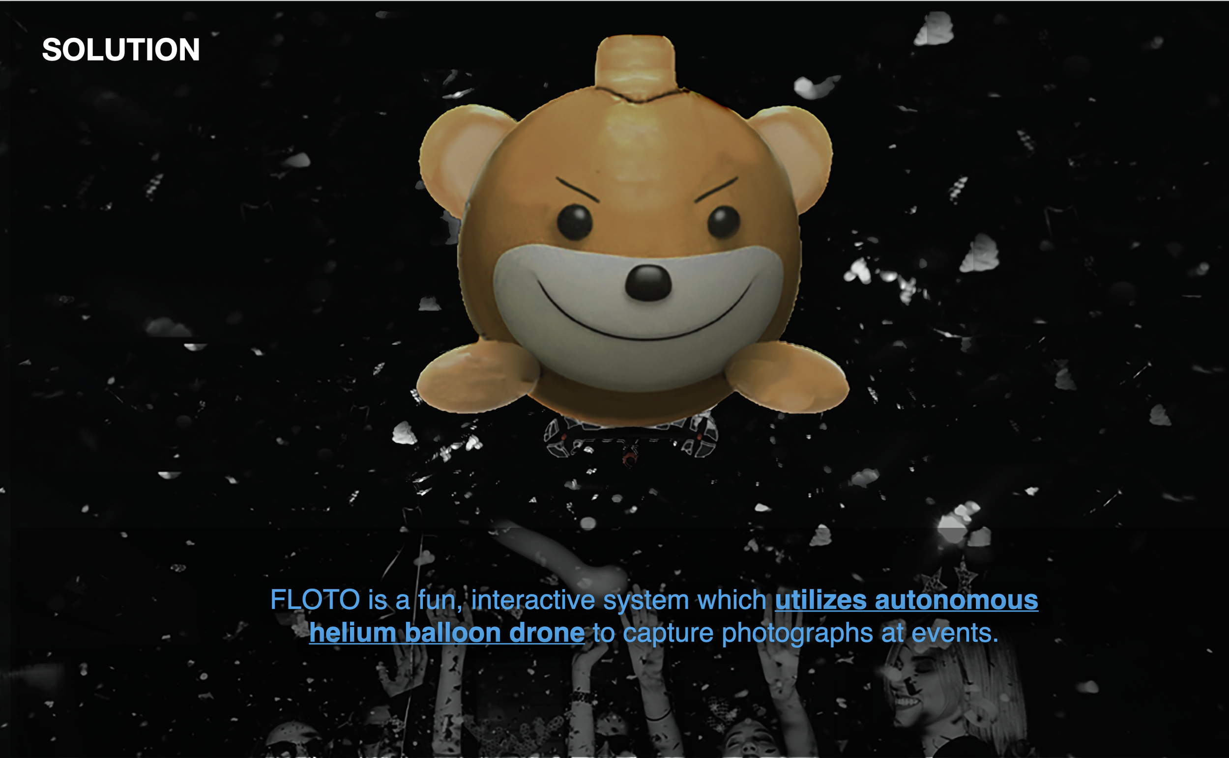 This project was undertaken in 2012, when commercial drones had just emerged and were largely seen as recreational gadgets. Our goal was to explore how drones could create real commercial value despite technical limitations, legal regulations, and negative social perceptions around privacy and surveillance. We designed FLOTO—a helium balloon–based flying photo booth for events—paired with a private post-event social space where guests could view, share, and keep interacting with the captured memories.
