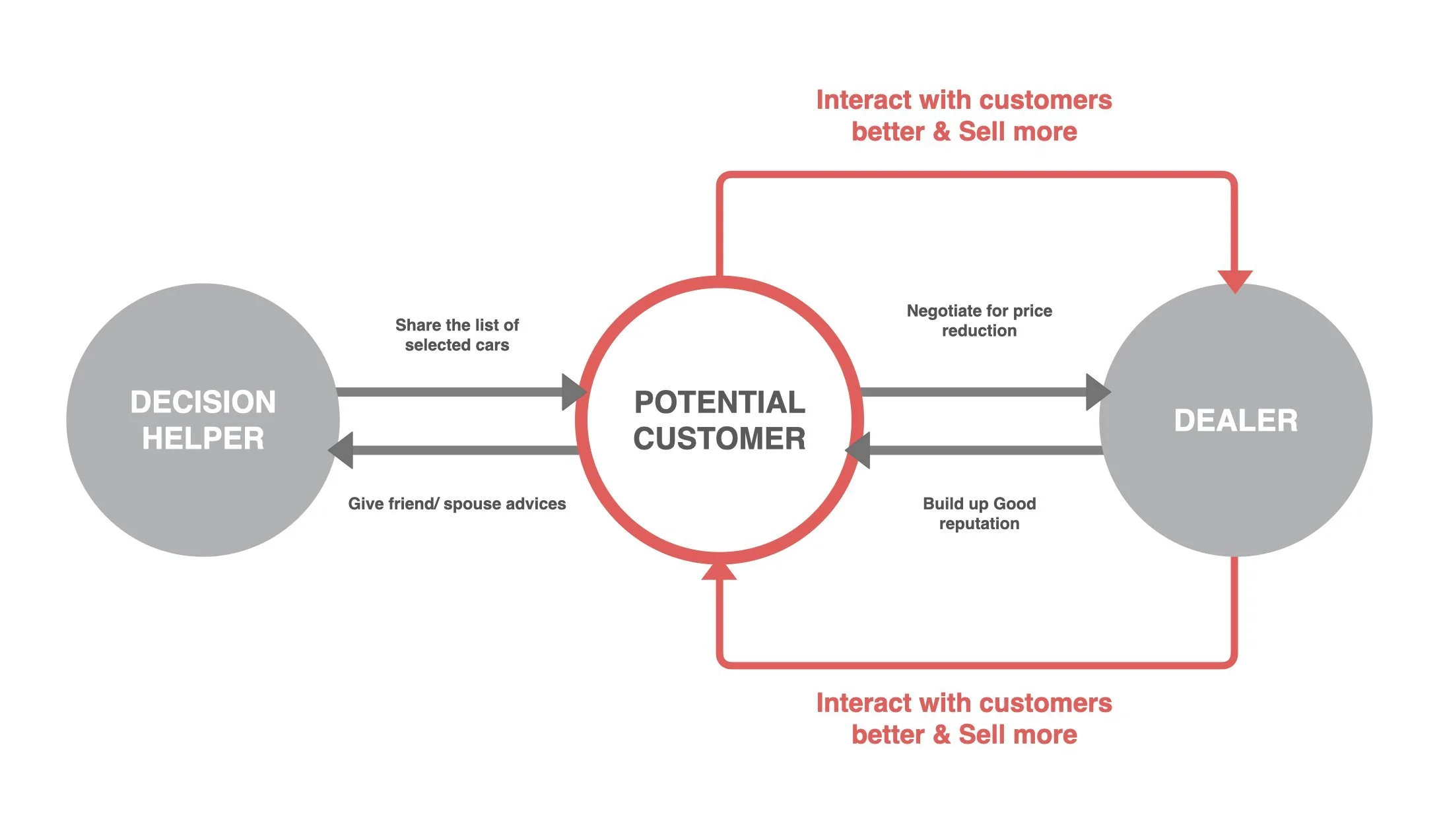I explored the desires of key stakeholders in the car-buying decision process: potential customers, dealers, and decision helpers. Potential customers seek control and dominance in decision-making, forming the central design focus. Dealers aim to better connect with and sell to customers, while decision helpers assist in evaluating decisions. By understanding these needs, I designed app interactions to facilitate a seamless value exchange among all stakeholders.