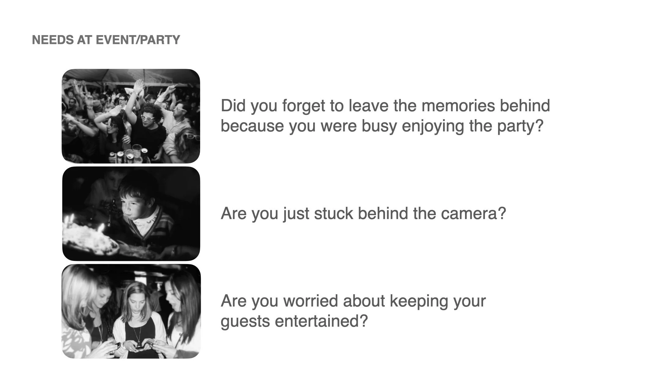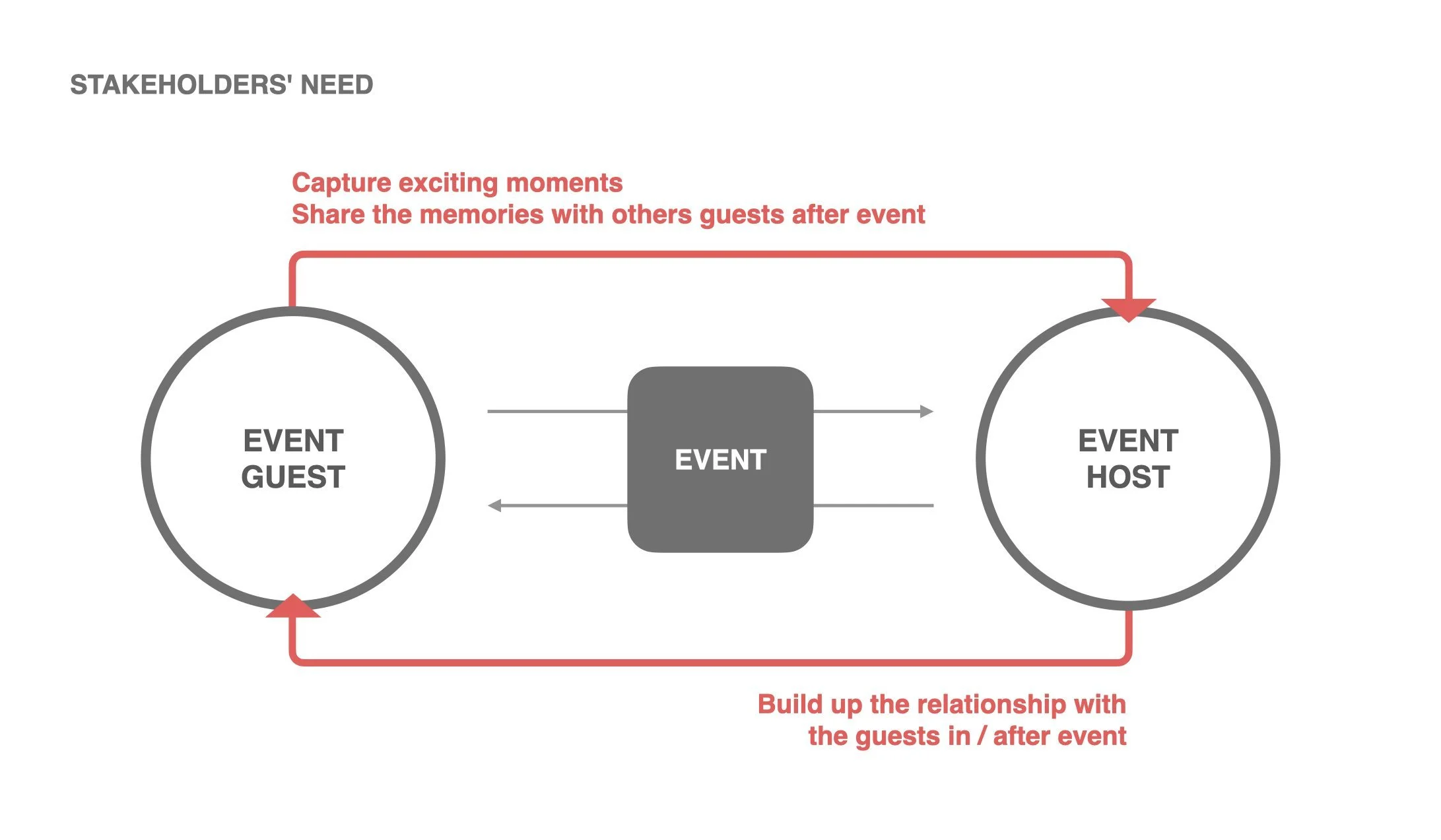 Every event is centered around the relationship between hosts and guests. Hosts aim to create a memorable experience and maintain meaningful connections after the event, while guests want to capture and share these moments with friends.