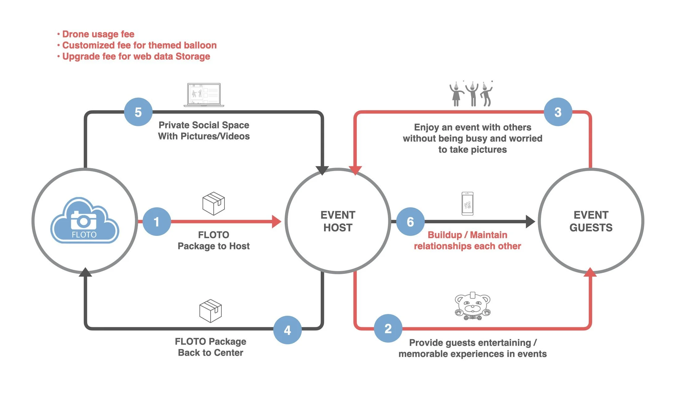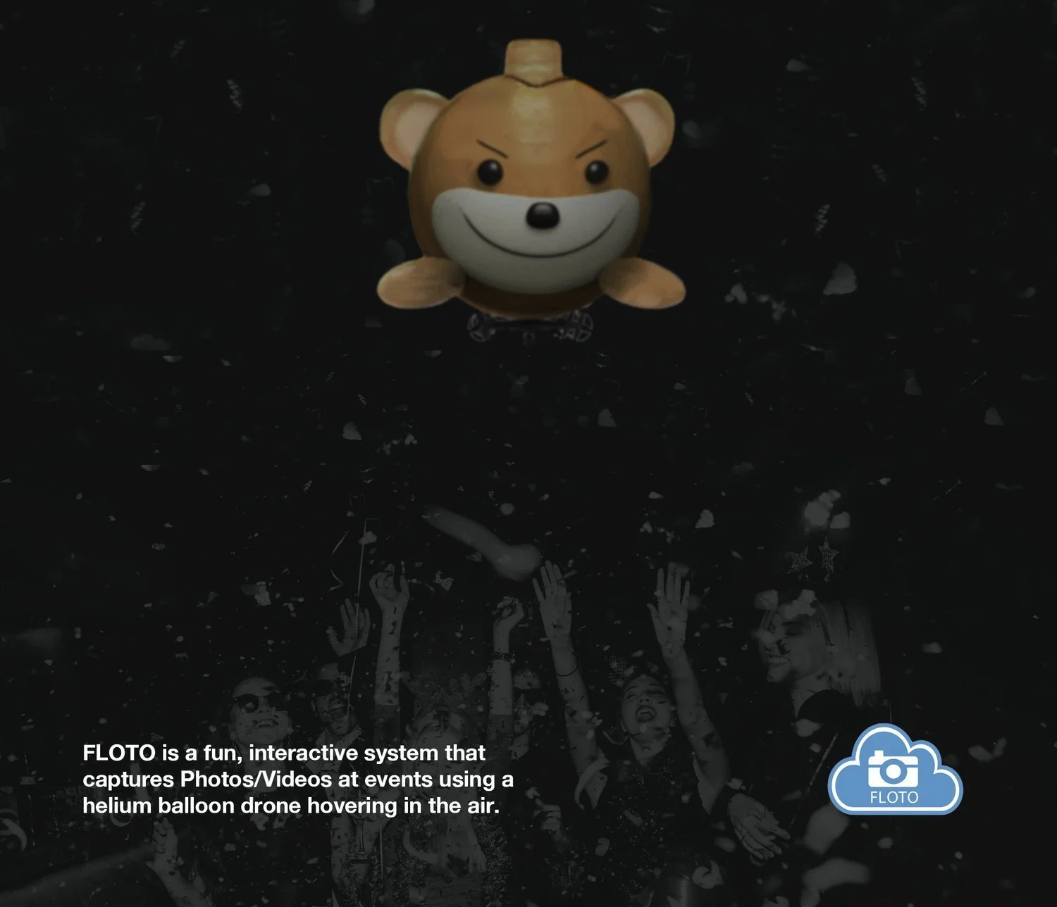 FLOTO is a fun, interactive system that uses a helium balloon drone to capture images during events. The FLOTO drone hovers and moves on demand, ensuring key moments are captured. Unlike large communities with limited interaction, FLOTO provides an exclusive social space for hosts and guests, fostering interaction and building relationships that extend beyond the event itself.