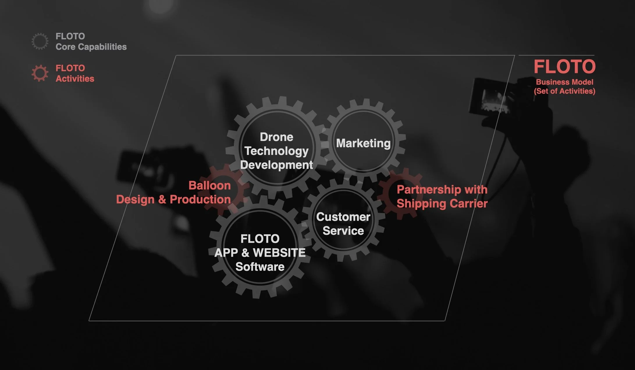 One key challenge was drones' limited 25-minute battery life. To maximize efficiency, I developed a flying photo booth using helium balloons. The business model added value by creating an exclusive online community where hosts and guests could interact and build connections during and after events through shared images.